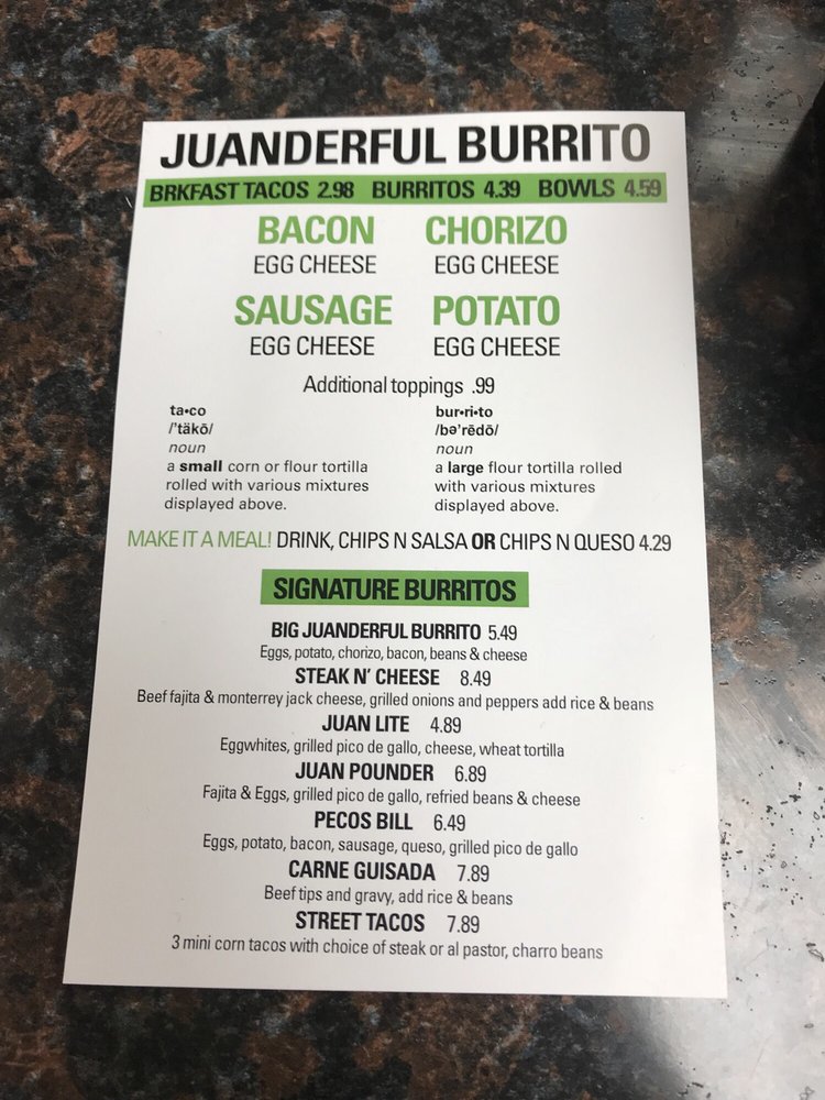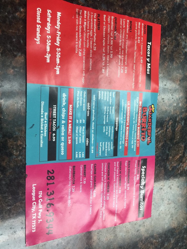 Juanderful Burrito is a breakfast and brunch spot in League City, TX, offering a range of Mexican delights. With options for takeout, delivery, reservations, and catering, this casual eatery is perfect for groups and families. Customers rave about the Tater Tot Rito, flavorful breakfast tacos, and generous portion sizes. The friendly staff and quick service add to the overall positive dining experience. The menu boasts a variety of burritos and tacos, each packed with delicious ingredients. From the efficient drive-thru service to the cozy indoor seating, Juanderful Burrito is a hit among locals for its tasty and affordable meals. Whether you're a fan of breakfast burritos or flavorful tacos, this spot is a must-try for those craving Mexican fare with a twist.